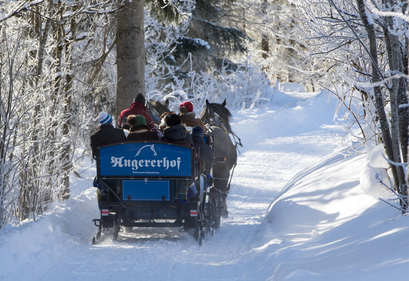 Besonders romantisch ist eine Schlittenfahrt mit dem hauseigenen Pferdegespann. Ob bei strahlendem Sonnenschein, Schneetreiben oder abends bei hellem Mondschein eine Kutschenfahrt ist und bleibt ein unvergessliches Erlebnis.