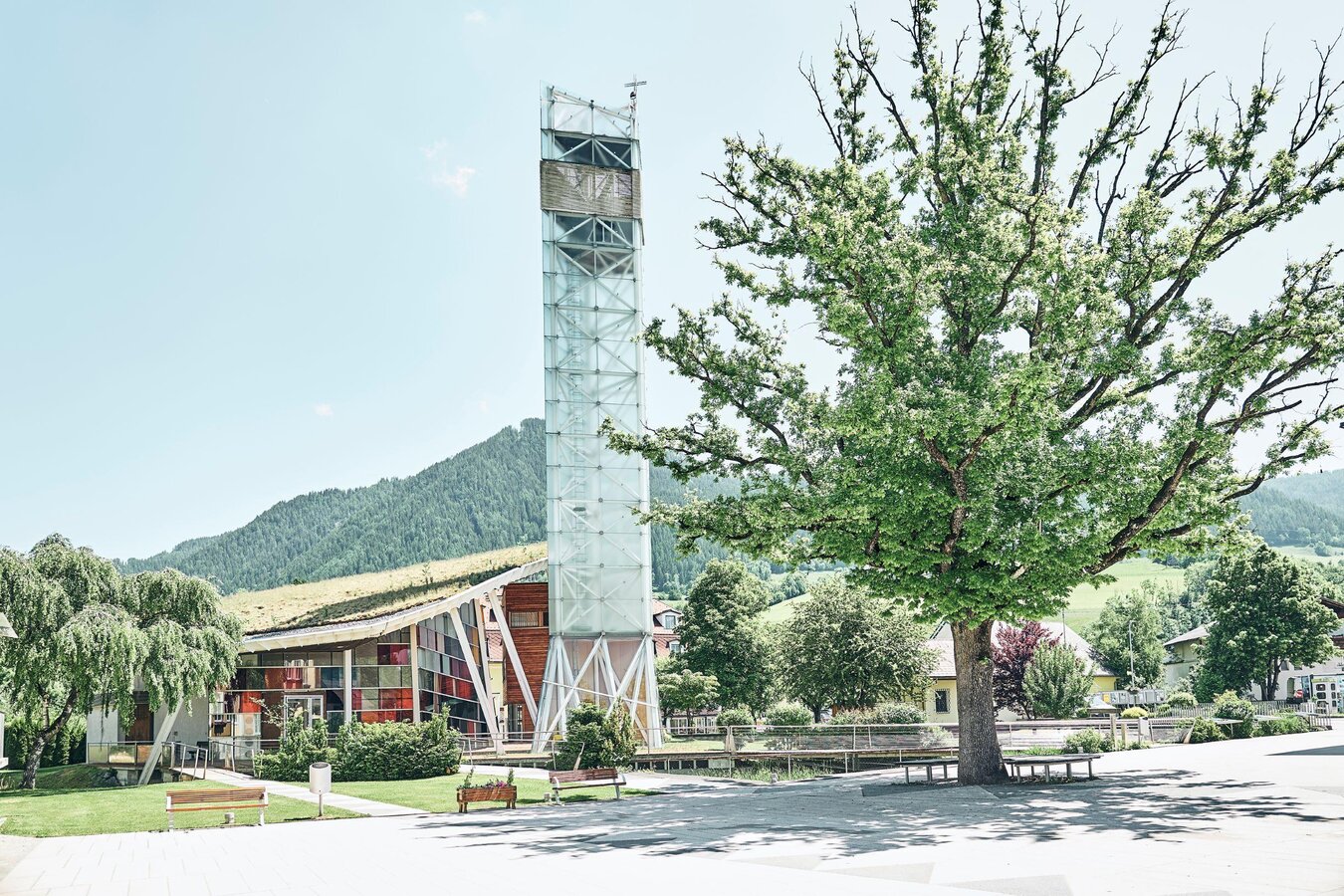Zeitgenössische Architektur in einer der jüngsten Kirchen der Steiermark. Fels, Glas und Holz in einer außergewöhnlichen Synthese.
