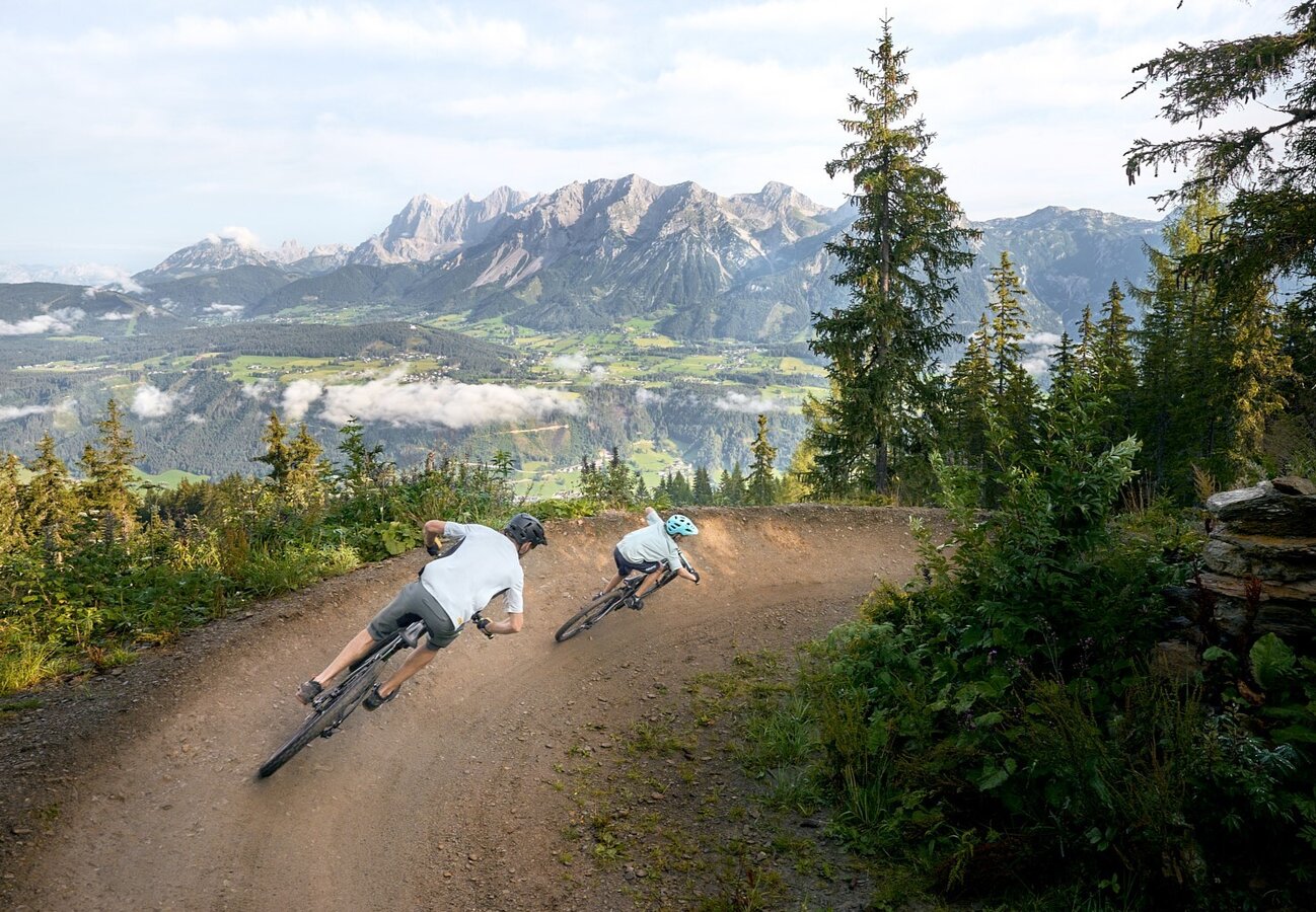 Über den Uphill Flow Trail gelangt man auch mit dem E-Bike zum Start der Flowline, so hat man schon beim Hinauf-Fahren richtig Spaß und eine Fitness Workout. Oder man nimmt die Planai Gondelbahn und fährt die Flowline mehrmals hintereinander.