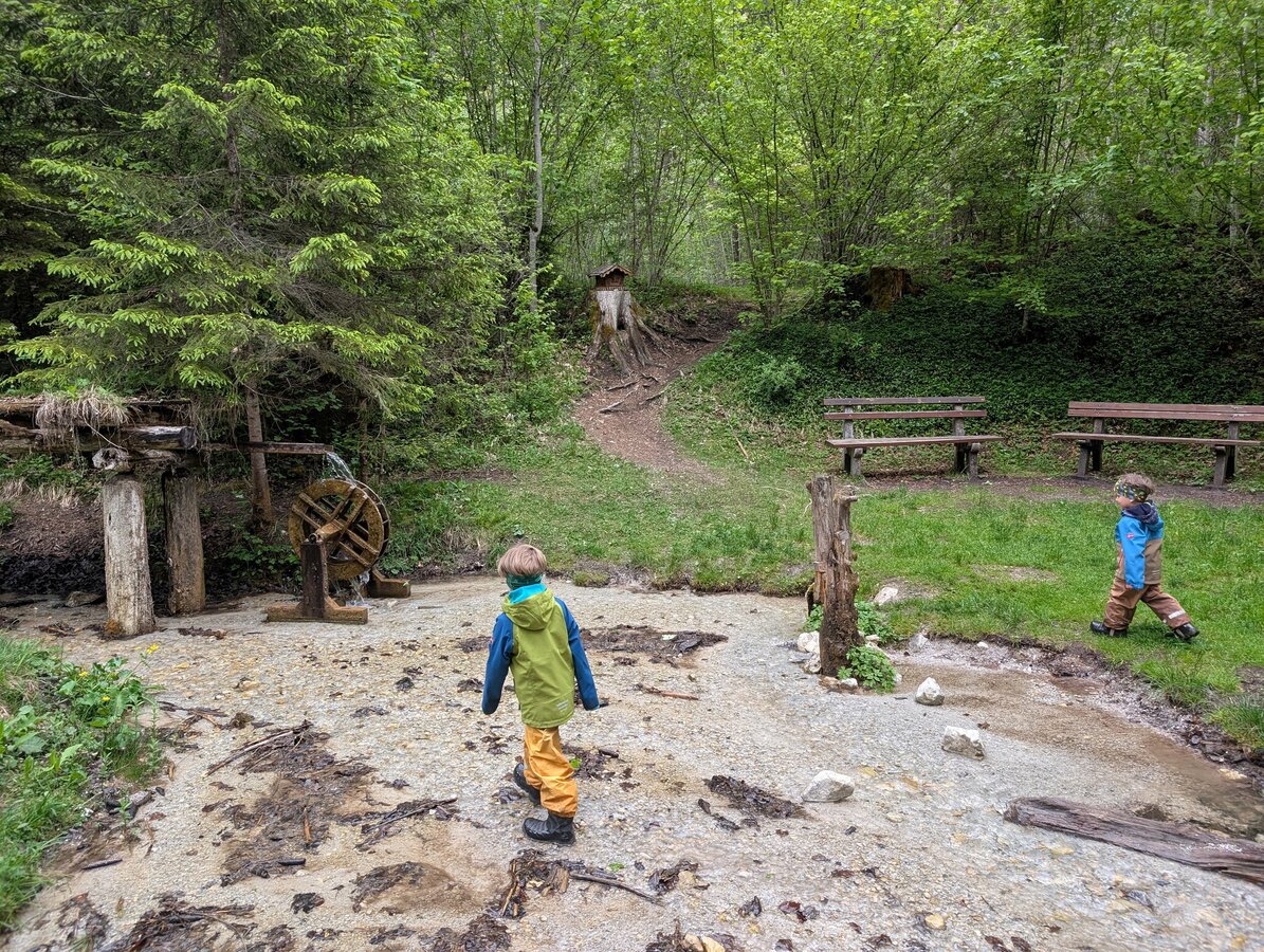 Deine Tour beginnt beim Parkplatz der Kneippanlage in Weißenbach. Von hier aus wanderst du Richtung Wald, links am Schilderbaum vorbei, hinein in die wohltuende Ruhe der Natur. Bald erreichst du den idyllischen Wasserpfad Siebenbrünn – mit plätschernden Bächlein, kleinen Wasserrädern und liebevoll gestalteten (Wasser-)Spielstationen.