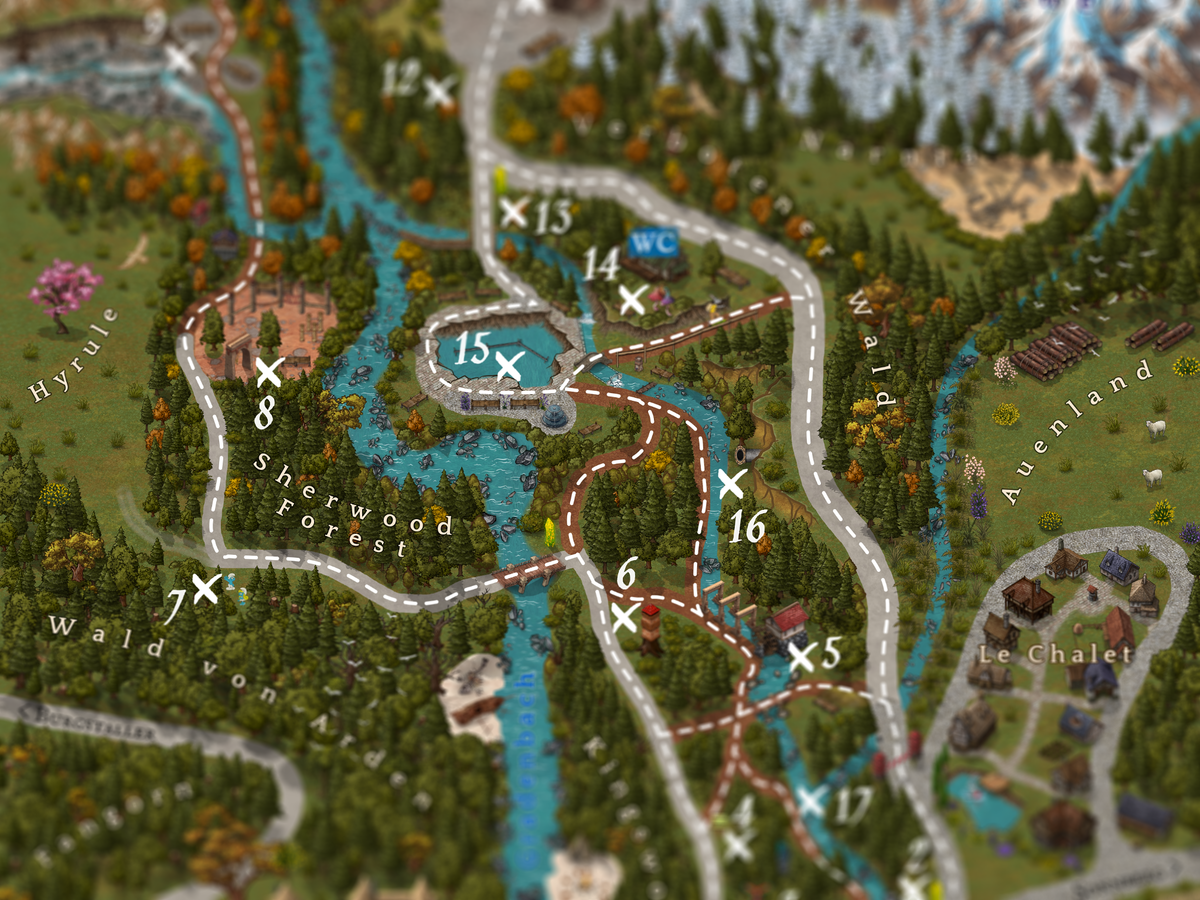 X gekennzeichnet. An jeder dieser Stationen erwartet die Abenteurer ein