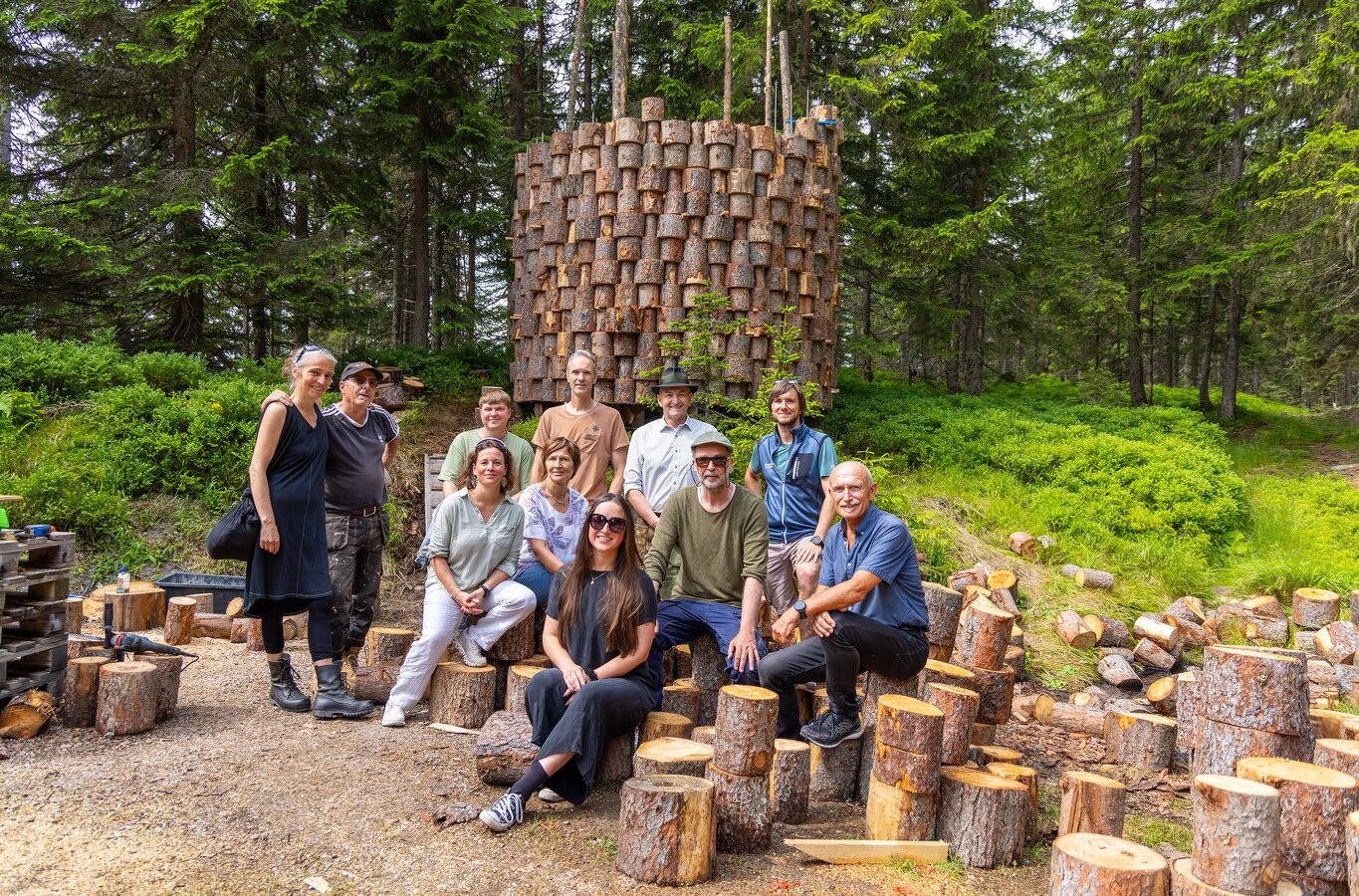 links hinten, Yvonne Krisch, Stuart Ian Frost (Künstler), Edvardas Racevicius (Künstler), Manfred Engelhardt (Ursprung), Ernst Fischbacher (BGM Ramsau), Gerhard Pilz (TVB), mitte, Mag. Barbara Schiefer (LEADER), Ing. Josefa Elisabeth Giselbrecht (LEADER), Robin Molenaar (Kurator), vorne, Pia Pachernegg (Ursprung),HR Mag. Dr. Vzbgm. Anton Hausleitner (LEADER)