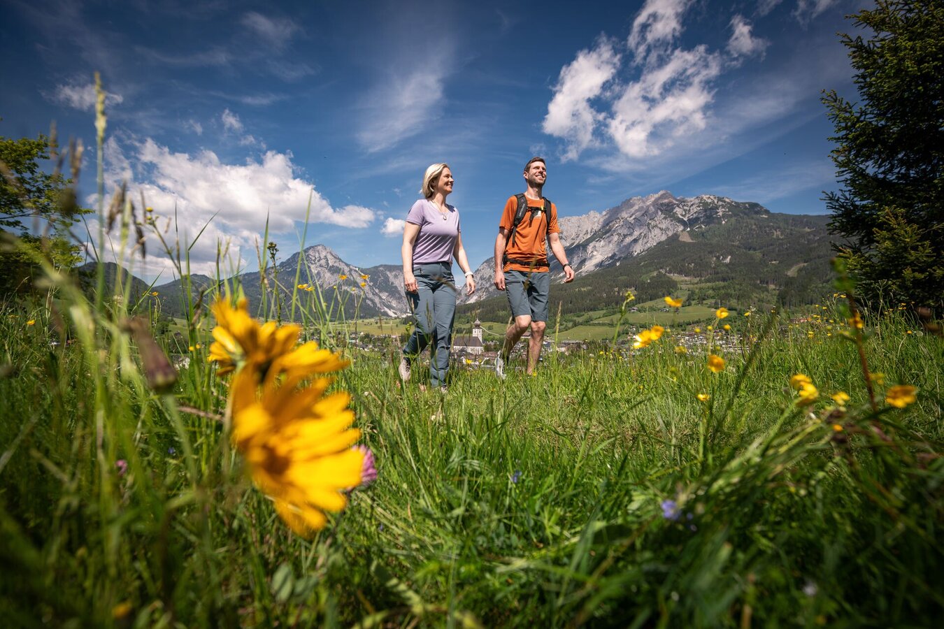 One walks comfortably from Gröbming Ort to Oberwinkl and through the forest to the Kneipp facility. Then you continue to Weyern and along the edge of the forest until you reach the Gröbminger Alm. From here you can enjoy the great view of Gröbming and the panorama of the mighty Kammspitze. The Gröbminger Alm invites you to linger. The small petting zoo with rabbits, goats and sheep provides a great experience for the whole family. Afterwards you walk along the Stoderstraße back to Gröbming.