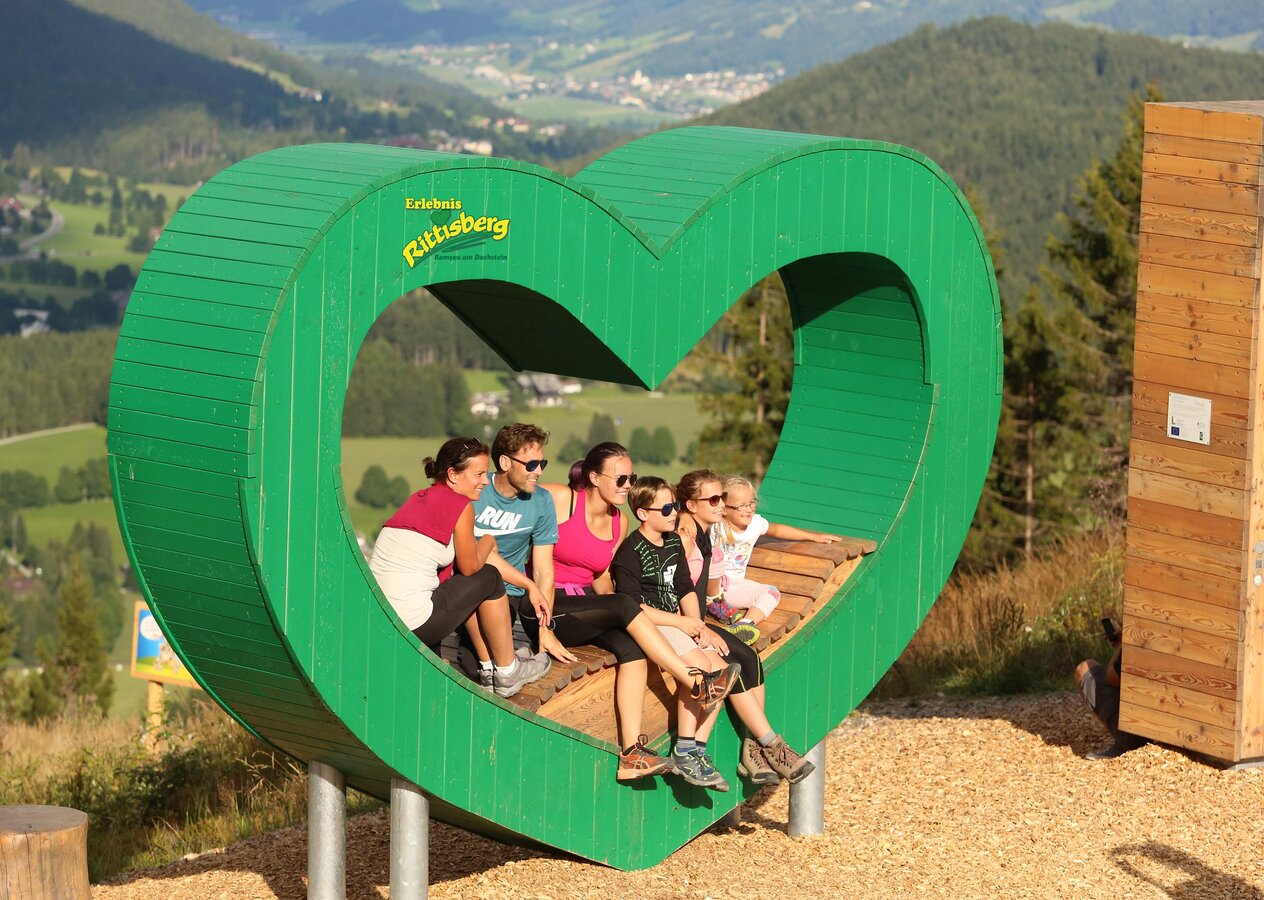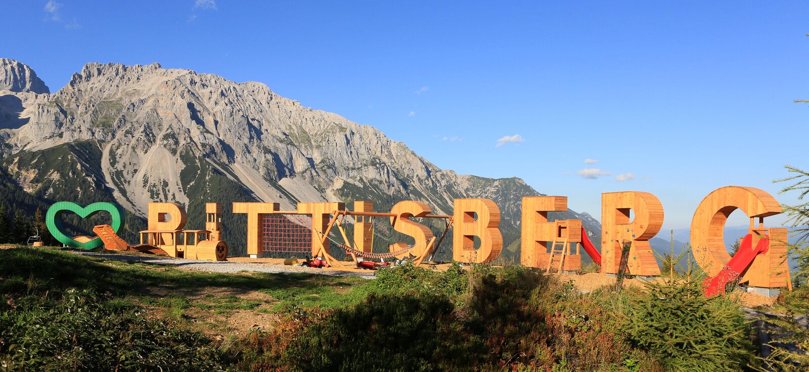 Attention kids: the height playground "I LOVE Rittisberg" is opened. You can reach it either via the Märchenwanderweg or comfortable with the quad chairlift. Arriving at the summit of Rittisberg, opens up for you a paradise: A are integrated solid wood crafted lettering in the three-meter-high letters swings, climbing nets and climbing frames.