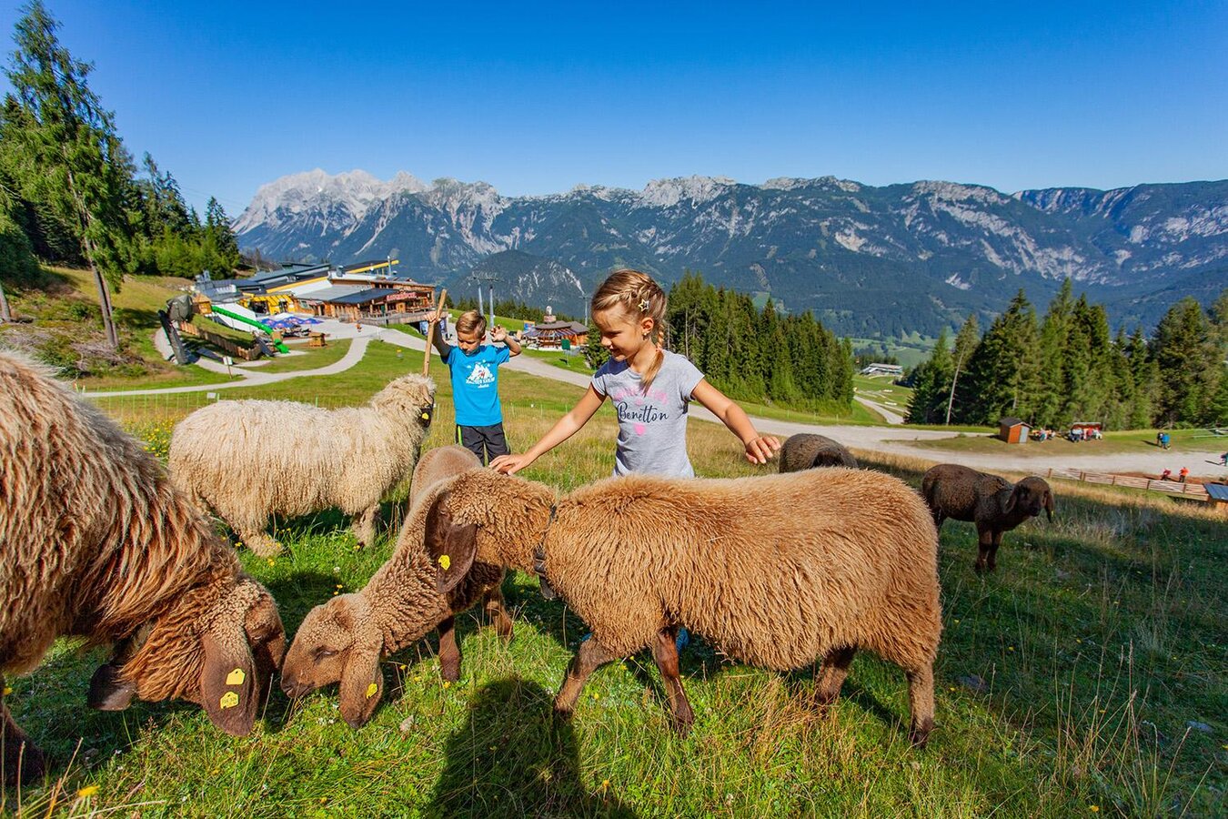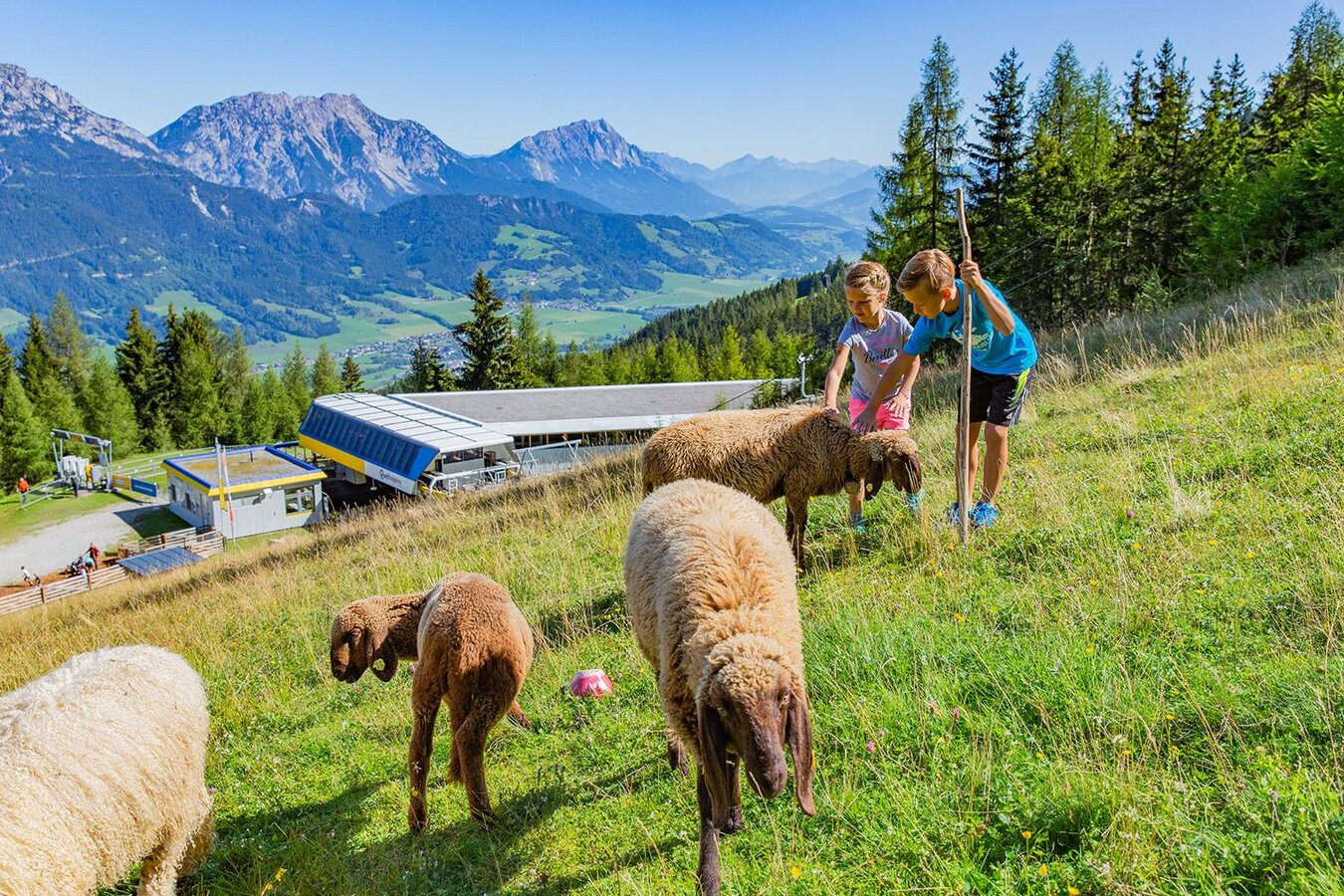 With 800 sheep on the mountain and our petting zoo at the 8-seater gondola mountain station at 1,424 metres above sea level, you can experience our woolly sheep, lambs, ponies, goats, rabbits and mini pigs up close. Our tip: Look out for our shepherd Franz, who herds the sheep with his herding dog "Jim" throughout the summer.