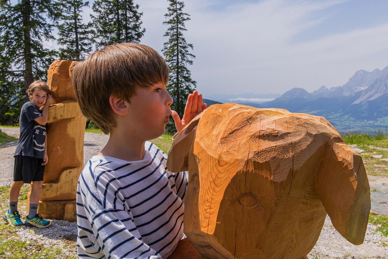 SchafsinnTeich Hauser Kaibling: Das lustige Schaferl-Springen, das Schafgeflüster, gemütliche Rastplätze mit traumhaftem Ausblick auf den Dachstein und vieles mehr runden das Erlebnisangebot am neuen SchafsinnTeich ab.