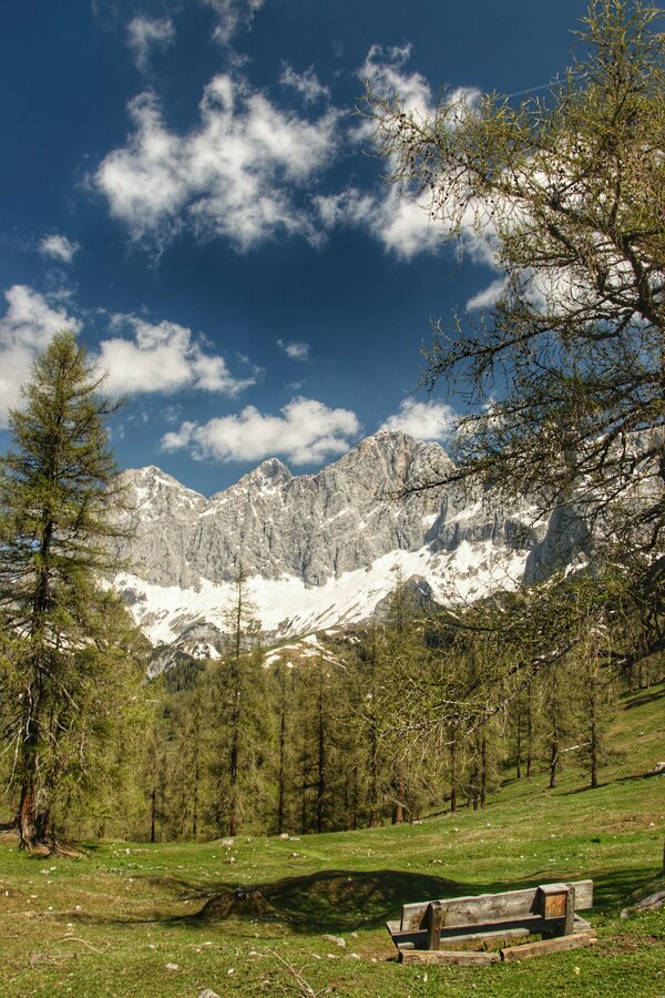 No matter what time of year, the Brandriedl with views of the impressive Dachstein triumvirate is always worth a visit. This circular hike is an ideal introduction to the hiking season. Starting from the hiking parking lot at Gasthaus Edelbrunn, the Roseggersteig trail leads you to the Brandriedl. Who wouldn't want to take a seat here and enjoy the spring awakening? On the way back, we also recommend a detour to the Dachsteinkircherl.